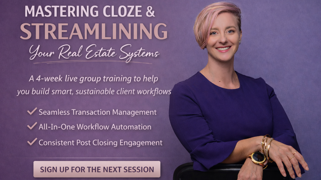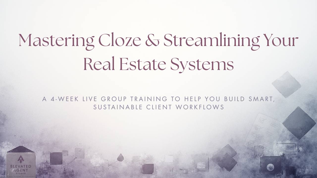 Mastering Cloze & Streamlining Your Real Estate Systems is a live, guided group coaching program where we build your client workflows together.